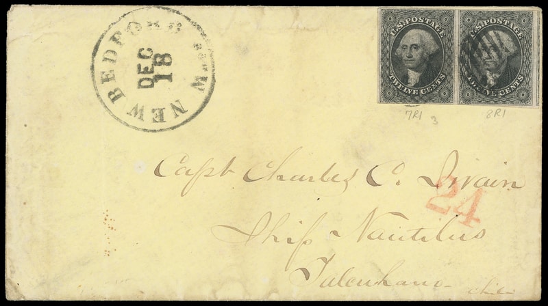 1851, 12¢ gray black, horizontal pair, pos. 7-8R1, canceled by circular grids, matching "New Bedford Mass. Dec 18" cds on yellow cover to Talcahuano, Chile addressed to Capt. Charles C. Swain, Ship Nautilus, New York red "24" cent credit handstamp; edge wear, missing additional 10¢ stamp for the 34¢ rate, Fine appearance.