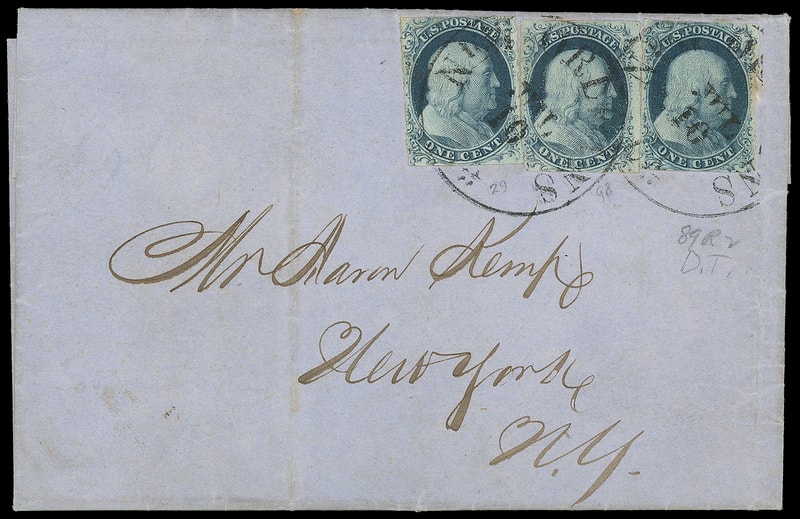 1851, 1¢ blue, type II, positions 29R2, 98R2, 89R2 with the most pronounced double transfer on any U.S. stamp , three singles, strong color, margins to slightly in, tied by two strikes of "New Orleans La. Jul 10" balloon style cds on blue 1856 folded letter to New York N.Y., 89R2 with small tone spot, a Very Fine use with the 89R2 double transfer.