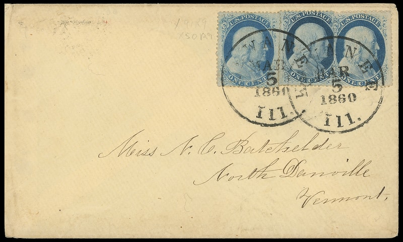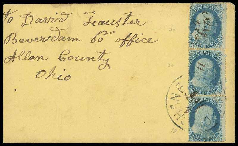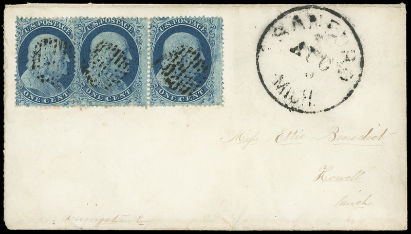 1861, 1¢ blue, type I, plate 12, pair and single, each cancelled by centrally struck small grid cancel, matching "Sanford Mich, Aug" cds on small ladies cover to Howell, Michigan, Very Fine and scarce type 1 stripe on cover.