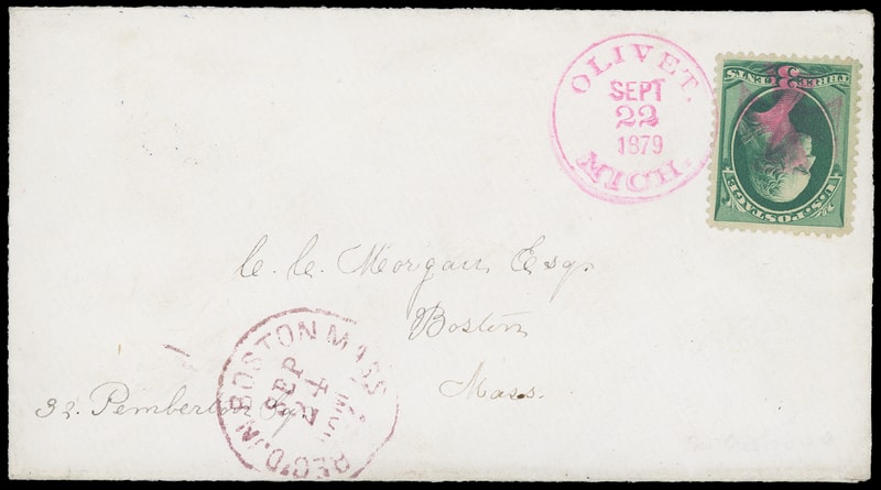 1873, 3¢ green, C.B.N.C. printing, exceedingly well centered within large margins, tied by pink maltese cross fancy cancel duplexed with "Olivet. Mich. Sept 22, 1879" cds on immaculate cover to Boston Mass., magenta "Rec'd in Boston, Mass. Sep 24" cds, blue "Boston Mass., Carrier, Sep 24" backstamp, fresh and Extremely Fine gem.