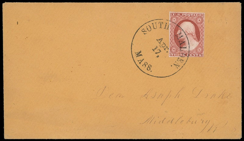 1851-52, 3¢ brownish carmine, type II, position 14L2L, large margins to close, deep shade, tied by sharp "South Malden. Mass. Apr 17" cds on immaculate orange cover to Middlebury Vt., a Superb gem.