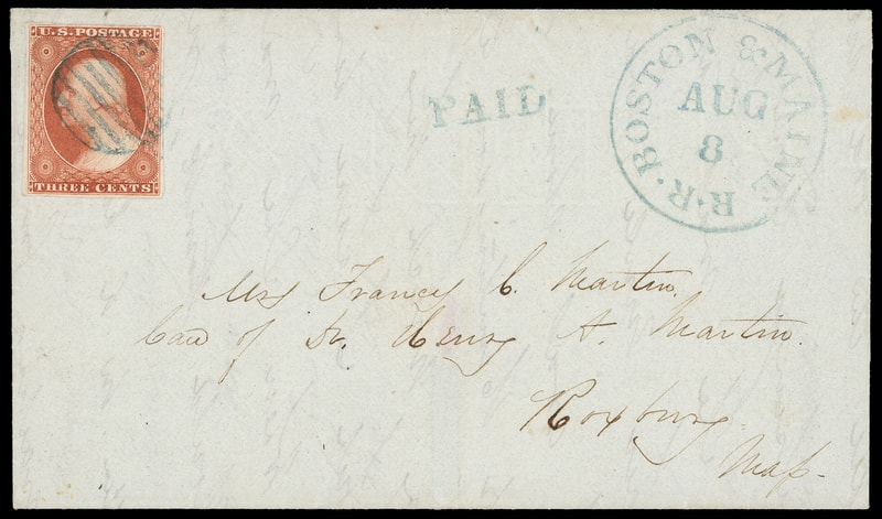 1851, 3¢ orange brown, type II, large margins to touched at top, tied by blue circular grid, matching "Paid" and " Boston & Maine R.R. Aug 8" (50-A-3) route agent cds on gray folded cover to Roxbury Mass., Extremely Fine and choice orange brown railroad use, ex-Wagshal, Feldman .