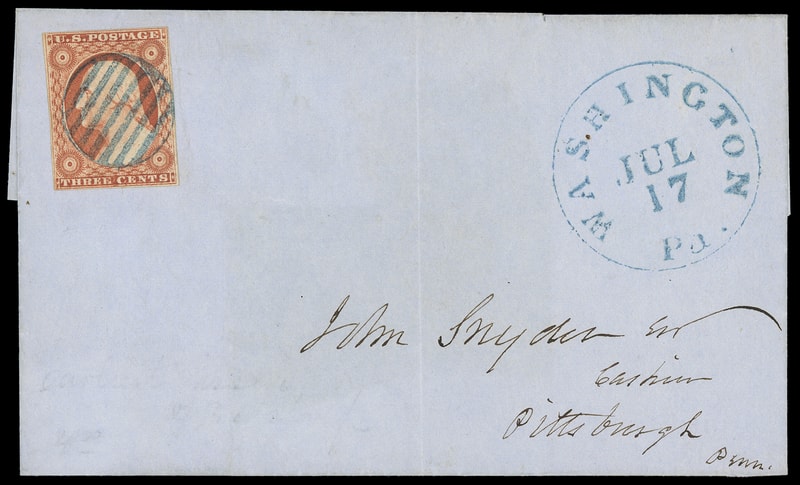 1851, 3¢ orange brown, type I, position 22R1E, four clear to full margins, canceled by sharp blue circular grid cancel, matching "Washington Pa. Jul 17" cds on circa 1851 folded cover to Pittsburg Pa.; some of back missing, Very Fine and choice first month use.