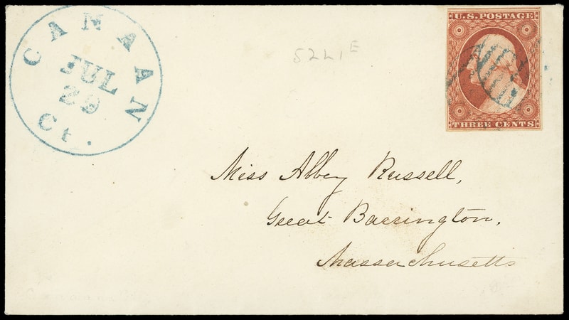 1851, 3¢ orange brown, type I, position 52L1E, rich color, four large margins except just touched at top left, adjacent stamp shows at top, tied by two strikes of blue circular grid, matching sharp blue "Canaan Ct., Jul 29" cds on immaculate small lady's cover to Great Barrington Mass.; Chase notes "Very Fine" on reverse, Extremely Fine and beautiful.