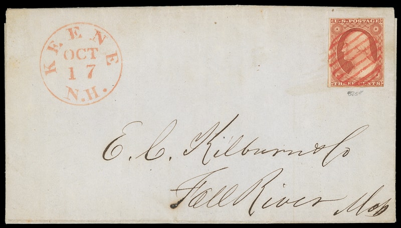 1851, 3¢ orange brown, type II, position 45L5E, clear to huge margins just shaving lower right corner, canceled by neat large red 7-bar circular grid, matching sharp "Keene N.H. Oct 17" cds on 1851 gray folded letter docketed from Chishin Mills to Fall River Mass, Very Fine and attractive.