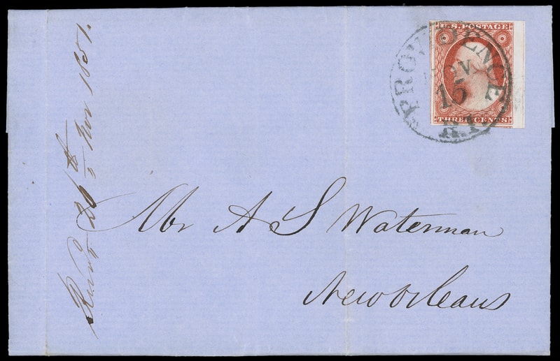 1851-52, 3¢ brownish carmine, type II, position 10L1L, right straddle-line single with huge margins including parts of stamps at left and bottom, tied by "Providence R.I. Nov 15" cds on 1851 blue folded letter to New Orleans La., couple file folds, Very Fine and choice early use; signed Amonette on reverse "Early use of brownish carmine".