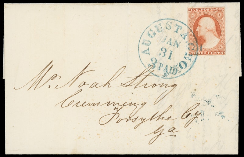 1851, 3¢ experimental orange brown, type II, 86R1L, four margins except touched at bottom left, tiny margin flaw at top, tied by sharp blue "Augusta. Geo. '3 Paid' Jan 31" integral-rate cds on fresh 1852 folded letter to Cumming Ga.; couple file folds, Extremely Fine and beautiful, a premium color example of the Experimental Orange Brown variety.