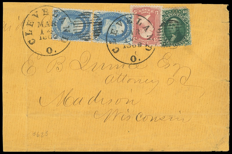 1861, 10¢ dark green, First Design, faulty, used with 1¢ blue (63) vertical pair and 3¢ rose (65) , all tied by "Cleveland O. Mar 14, 1862" duplex with circular grid cancel on orange cover to Madison, Wisconsin at five-times the 3¢ letter rate; reduced at left, Fine.