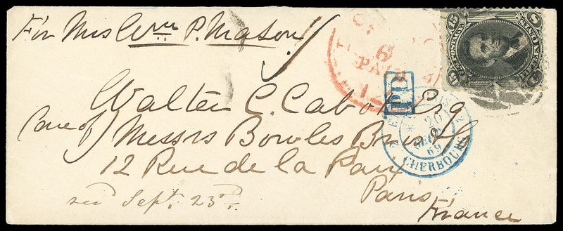 1867, 15¢ black, F. grill, tied by geometric cancel and partial red "Boston 'Paid 12' Sep 6" credit exchange cds on 1869 cover to Paris, France, blue Cherbourg (9.20.69) entry cds and matching small "PD" framed handstamp; bit of flap missing, Very Fine.
