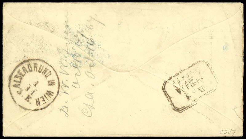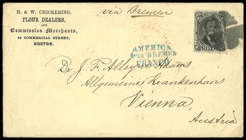 1866, 15¢ black, tied by quartered cork, partial red "N.York 'Paid 12' Brem. Pkt. Oct 12" credit exchange cds on amber H.&W. Chickering Flour Dealers, BostonMass. corner card cover to Vienna, Austria , endorsed "via Bremen" at top, blue "America/über Bremen/Franco" three-line exchange handstamp, Vienna (11.1) arrival backstamp, 1867 receipt docketing on reverse; couple tiny edge tears, Very Fine.