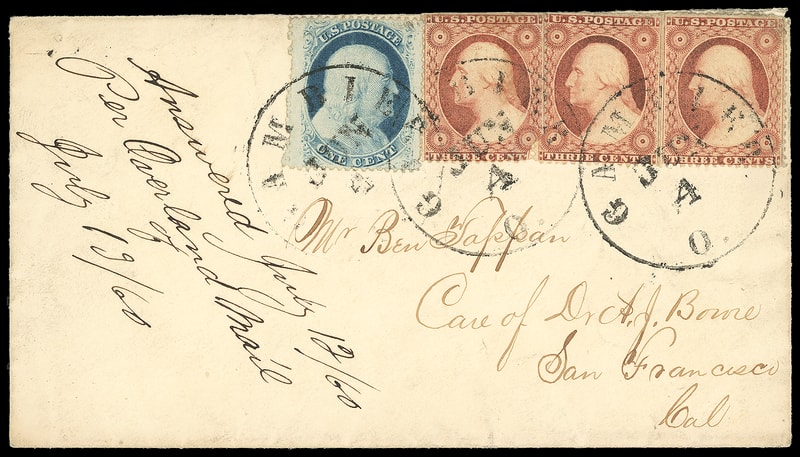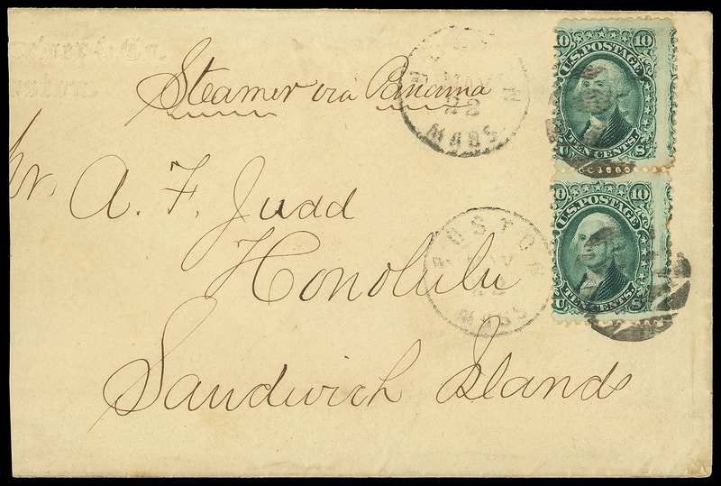 1861, 10¢ green, two singles, tied by segmented cork cancels duplexed with "Bosotn, Mass. Nov 22" cds on buff cover to Honolulu, Hawaii; reduced at left, some perf toning, Fine.