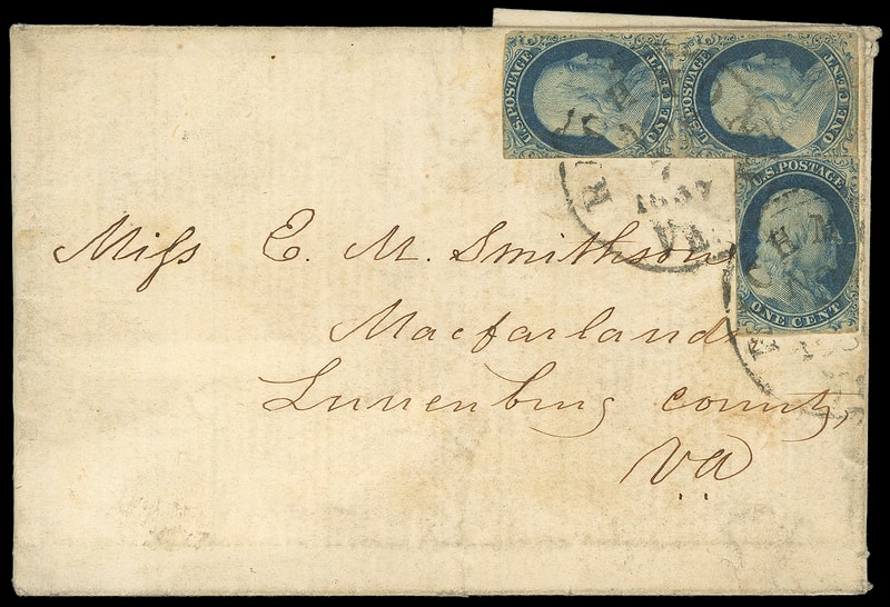 1852, 1¢ blue, type IV, pair and single, margins to in, tied by "Richmond Va. Nov 7, 1857" cds on folded letter to Macfarland Va.; small flaws and soiling, Fine.