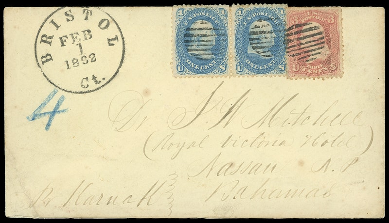 1861, 1¢ blue, pair, used with 3¢ rose (65) , canceled by circular grids, matching "Bristol Ct. Feb 1, 1862" cds on amber cover to Nassau, Bahamas , endorsed "Pr Karnak" at bottom left, Bermuda blue crayon " 4 " pence due for inland postage due; few perf flaws placement at edge, Fine and rare franking for the 5¢ British Mail rate to Bermuda, ex-Drews .