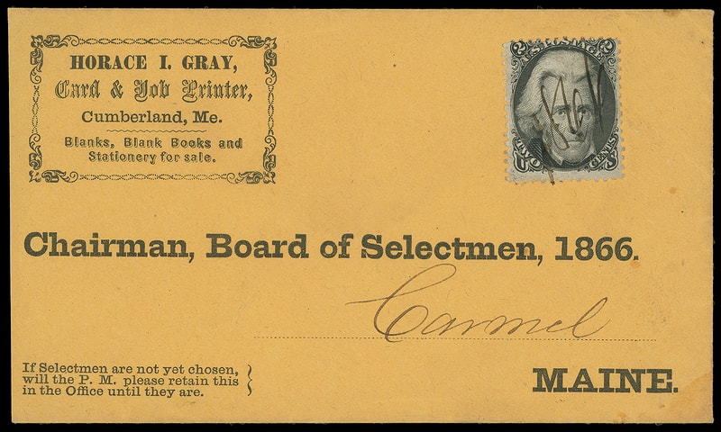 1863, 2¢ black, tied by manuscript " 1866 " year date cancel on orange Horace I. Gray, Card & Job Printer corner card cover with preprinted address to 1866 Maine Board of Selectman, Carmel, Maine; reduced slightly at left, Very Fine use.