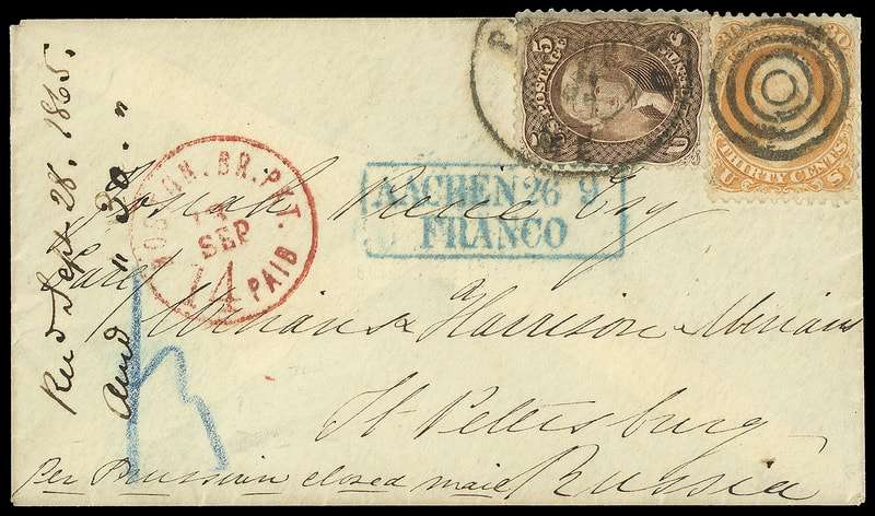 1861, 30¢ orange, used with 5¢ brown (76) , tied together by target cancel duplexed with "Portland Me. Sep 11 '65" double-circle datestamp on small 1865 cover to St. Petersburg, Russia , endorsed "Per Prussian Closed Mail" at bottom, red "Boston Br. Pkt. '14 Paid' Sep 13" credit exchange cds, blue boxed "Aachen Franco 26 9" transit ties 5¢, blue crayon "f3" credit rating, Sept. 28th 1865 receipt docketing; some minimal perf flaws from edge placement, Very Fine cover at the 35¢ rate via Prussian Closed Mail.