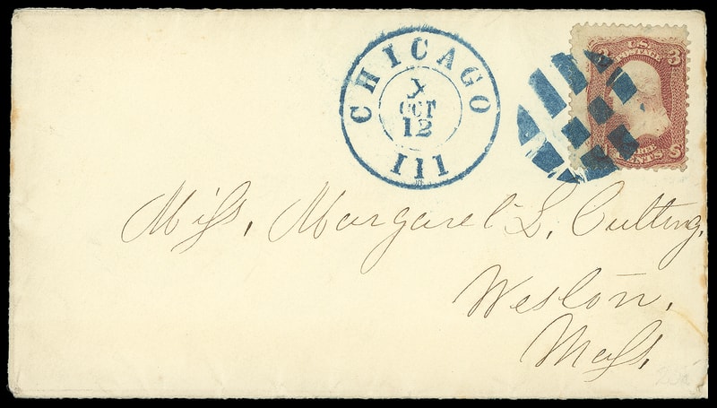 1861, 3¢ rose, tied by bold circular grid cancel duplexed with " Chicago Ill. 'X' Oct 12 " cds to Weston, Mass., Very Fine and choice Chicago Blue use, ex-Drews .