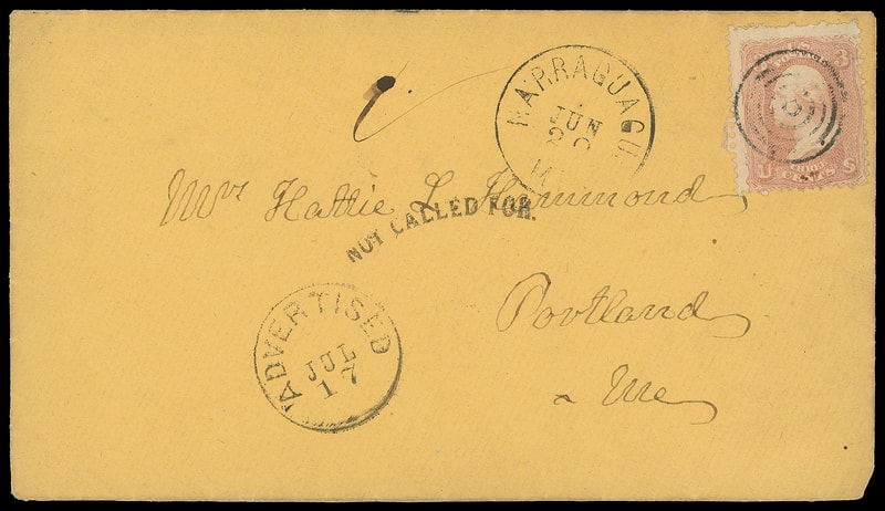 1861, 3¢ rose, canceled by five-ring target, matching "Narraguagua Me. Jun 20" cds on orange buff cover to Portland Me., "Advertised, Jul 17" cds, neat "NOT CALLED FOR" arc handstamp and "Portland Me. Aug 17" backstamp, F.-V.F. advertised use, ex-Drews .