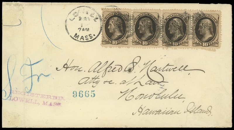 1879, 10¢ brown, A.B.N.C. printing, with secret mark, strip of four, tied by cork cancels duplexed with "Lowell, Mass. May 12" cds on legal-size cover to Honolulu, Hawaii , violet "Registered. Lowell, Mass." two-line postmark, New York purple "Registered, May 13, 1879" transit flap seals; reduced at left, otherwise Very Fine.