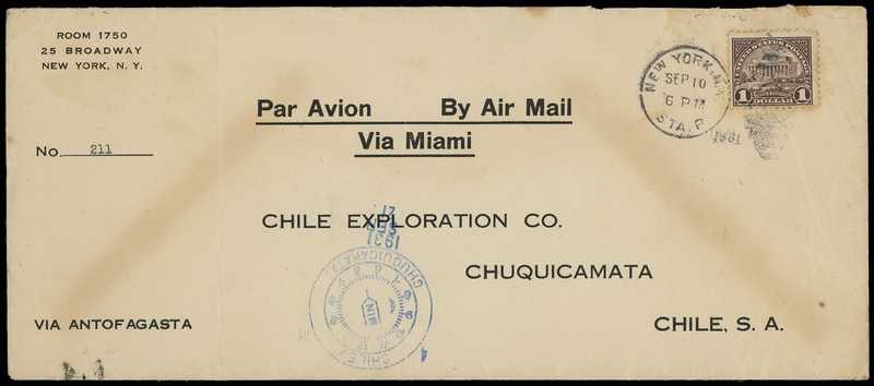 1923, $1 Lincoln Memorial, tied by "New York, N.Y., Sta. P, Sep 10, 1931" duplex on legal-size airmail cover to Chile, printed "By Air Mail Via Miami" endorsement; vertical crease at left, some envelope toning, F.-V.F. and scarce double-rate.
