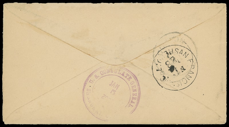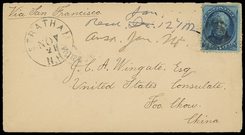 1879, 5¢ blue, A.B.N.C. printing, tied by grid cancel, matching "Stratham N.H. Nov 21" cds to J.C.A. Wingate, U.S. Consulate, Foochow, China, reverse with San Francisco (11.28) transit and purple " U.S. Consulate General Shanghai, China, Jan 5, 1882 " cds, arrival docketing, F.-V.F.