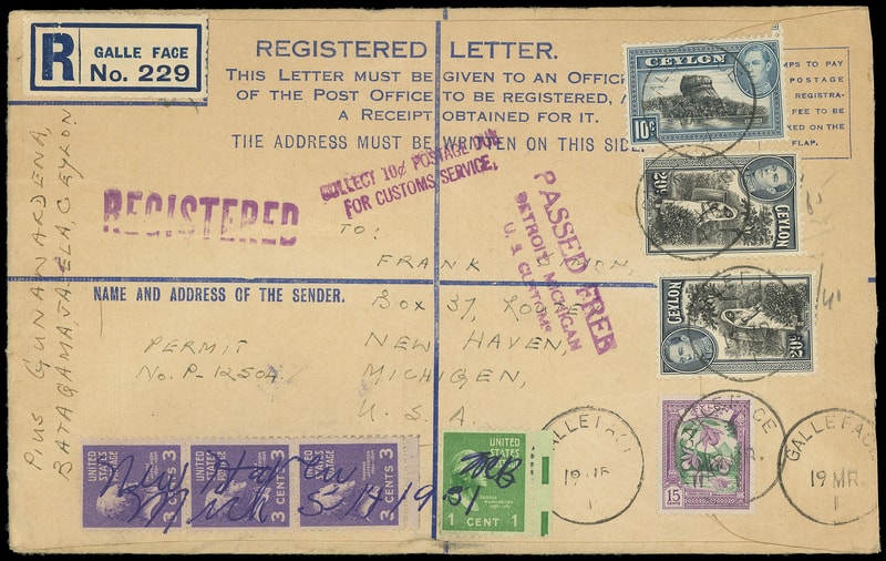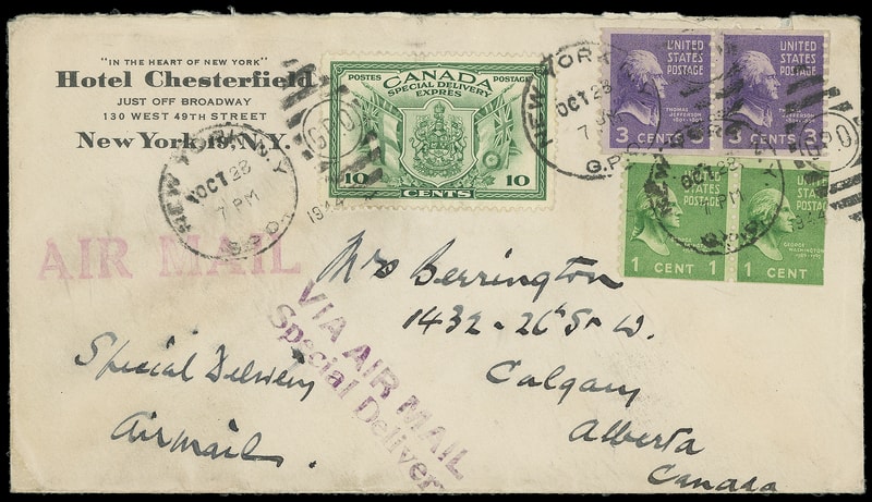 1938, 3¢ Prexie Postal History, group of 50 with many interesting and better items chosen for exhibiting including registered, special delivery, airmail, official seal use, domestic and international mail, uses from abroad, etc, note 3¢ coil strip/3 paquebot use from Sydney to Canada, 3¢ coils on legal-size cover to New Zealand, 1946 APO use to Canada, 1951 Ceylon registered combination use, etc; some faults, F.-V.F. or better, excellent group accumulated with an eye towards exhibiting.