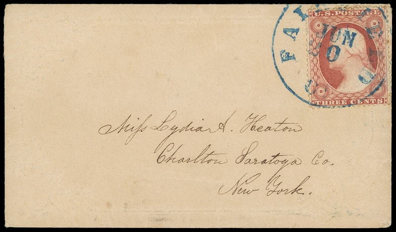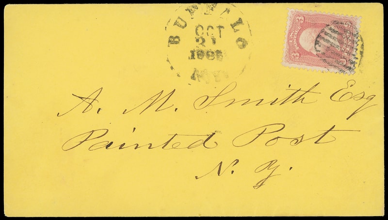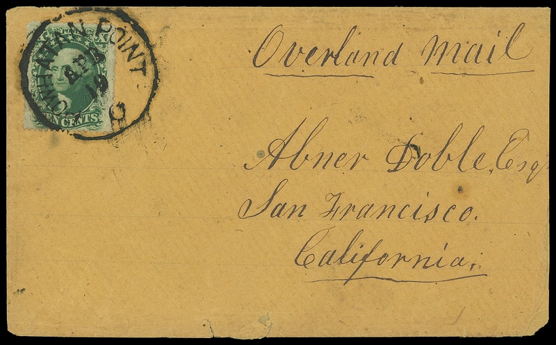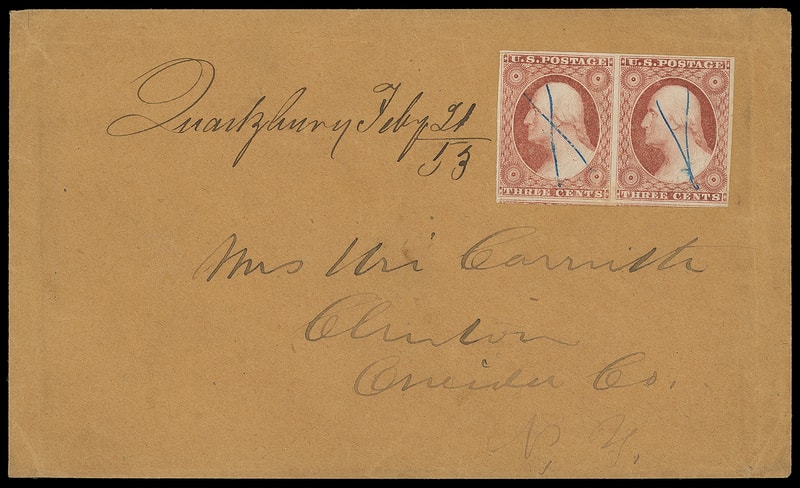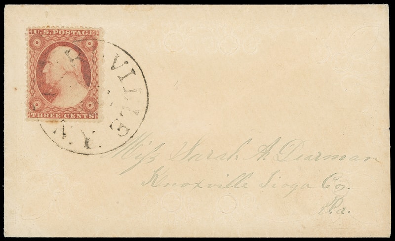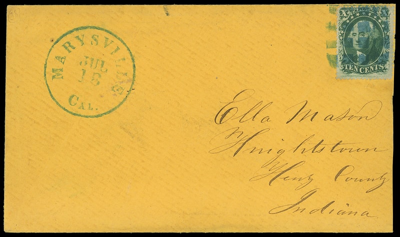 1851-57 Issue Postal History, better group of 19 covers with 3¢ (5), 10¢ (12) and 12¢ (2) frankings, note #11A (5) on New York Express Mail legal-size cover to Boston Mass.; #11A (2) on New Orleans La. "Registered" legal-size cover; #35 from Marysville with blue grid cancel, #35 Powhatan Point Oh. by "Overland Mail" to San Francisco Cal.; #35 San Francisco Cal. to No. Weymouth Mass., #35 on 1860 Oroville Cal. cover to Baltimore Md., #36 solo use on legal-size cover, #26, 36 on Utica N.Y. legal-size cover, F.-V.F. group.