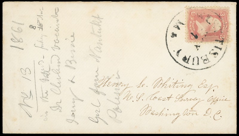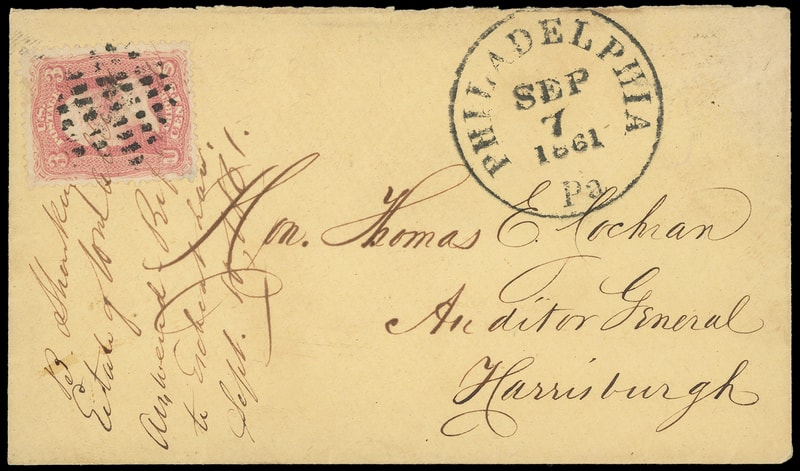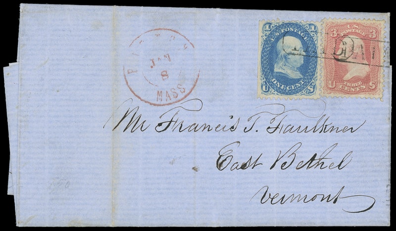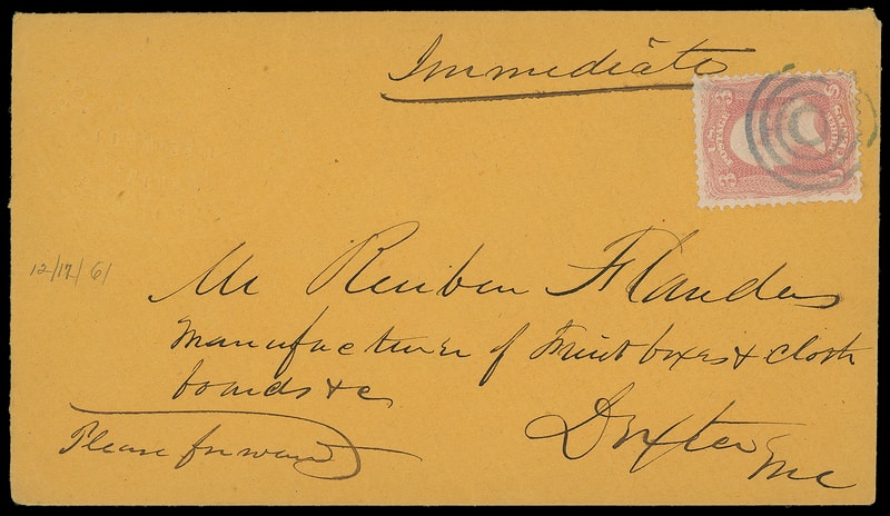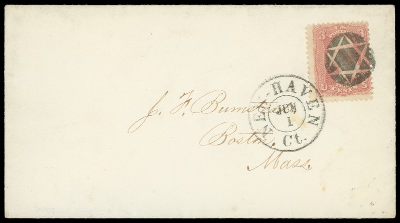 1861, 3¢ rose - Postal History, group of 35 covers with nice fancy cancels, shades, varieties etc, note New Haven Ct. negative star of david, Lee Mass. negative "3", Quincy Mass. masonic square & compass overstruck with Brooklyn Ct. sheel, Rutland Vt. blue geometric, Kensington N.H. "Paid 3" in Circle, #65 (10, faults) used on 1863 cover to Germany at 30¢ rate, etc.; some faults but general clean group, F.-V.F.