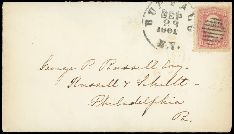 1861 3¢ Shades, small group of 5 covers comprising #64 from Buffalo; 64b from Philadelphia; #64b from West Tisbury Ms.; 63, 65 var. "bright rose"; and #63, 65 on Boston Mass. carrier cover, 3¢ small tear (PFC); some docketing on a couple, F.-V.F. group.