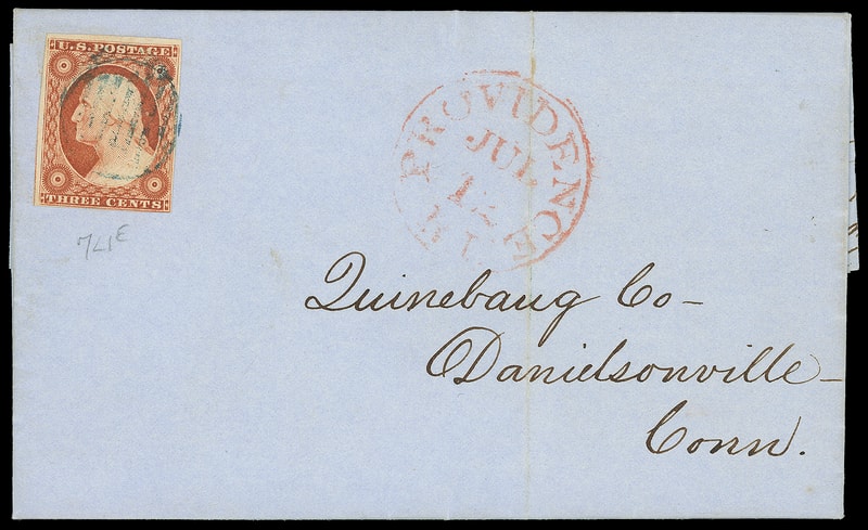 1851, 3¢ orange brown - postal history, collection of 18 covers mostly plated including several July 1851 uses, mostly margins to touched or in, note #10A on July 4th 1851 Providence R.I. use, #10A pos. 7L1E on Jul. 12th 1851 use, #10A on Jul. 15th 1851 Providence R.I. use, 10#10 pos. 14R1E on Jul. 22nd 1851 Detroit Mich. letter, #10A pos. 49R1E canceled by blue 13-bar grid on Minden La. cover, couple small Boston "Paid" grid cancel covers, etc.; some small faults, F.-V.F. group.