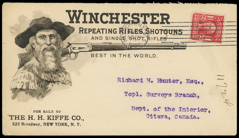 Advertising Covers, 1869-1900s, better collection of approx. 108 covers with mostly illustrated ad designs including multicolor, range of frankings incl. 2¢ 1869 #113, 2¢ Columbians, 2¢ Pan-Ams, etc, note 1904 Winchester Repeating Rifles, California Midwinter Expo used in 1915, B.A. Steves Billiard Supplies, Knox Gelatine, Schroeder Paint & Glass Co., Rub-No-More Washing Powder, Reading's Sesqui-Centennial, Peninsular Funances Stoves, Kansas Moline Plow Co., The E.E. Dickinson Co. witch hazel showing red robbed warlock, Charles E. Brown & Co. Massasoit Brand Coffee, plus watches, seeds, few modern ads, etc.; clean group, generally Very Fine or better.