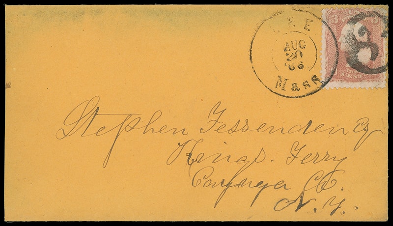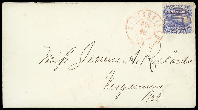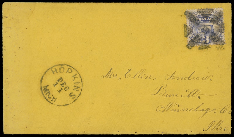 1869, 3¢ ultramarine - Postal History, group of 27 covers including some fancy cancels, well centered stamps, note Hopkins Mich. bold geometric, Taunton Mass. ladies envelope use (ex-Gibson), some interesting corner cards, New York City uses, 1869 Dead Letter Office use, Great Atlantic and Pacific Tea Co. ad, red Springfield Vt. use, etc; overall clean group, F.-V.F. or better.