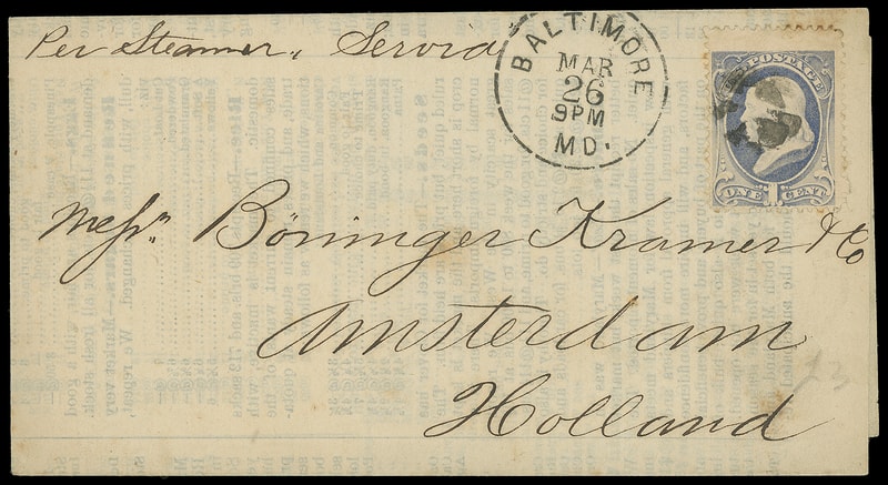 1870-88 Bank Note Issue Postal History, group of approx. 90 covers with mostly 1¢-3¢ frankings plus a few 5¢ and 6¢, color cancels, fancies, ad covers including some scarce designs, note #206 on Atlantic-Pacific Railway Tunnel Co. ad cover, #206 on circular to Holland, #156 tied by Chicago circular grid on red Adams Blackmer and Lyon Publishing Co. ad cover, #206 on cover with red Electric Light Oil illustrated ad showing oil barrel, #206 on American Paper Pail & Box Co. ad cover showing ice cream pail, $158 with dark red Washington Ga. duplex, couple Washington D.C. violet uses, 1880s-90s Mexican National Railway Co. correspondence group of 30 cover from Texas to Germany (some mixed condition), etc., overall F.-V.F. with many better covers.