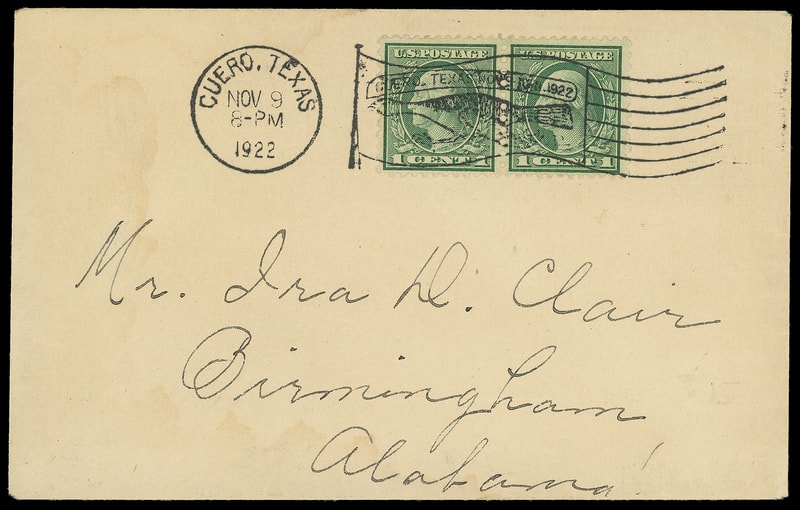 Postal History Consignment Balance, small box with mostly 1900s groups including some better FDCs, unusual cancels, machine cancels, airmail covers, RPOs and related, some rough stampless, note a weather forecast backstamp, postal card with "Murdered by a Footpad" printed message to a Sheriff, 832-834 $1-$5 Prexie FDCs, 1903-04 Barr-Fyke machine cancels, 1900 registered three-value franking to Germany, Cuero Texas running turkey machine cancel use, RFD cancels, C72c booklet pane FDC, etc, F.-V.F. and interesting lot.