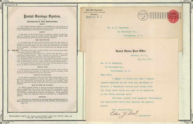1911 Official Postal Savings Collection, small collection mounted on double-wide pages including printed Postal Saving System Information for Depositors, 1911 postmaster reply to "non-resident" as unable to accept deposit; O125, O126 on registered UO72 entire, O122, O126 on UO72 registered entire (O126 cat. $225 on cover); mint UO72 entire, mint UO72 with penalty clause and defaced indicia; UO72 strong reverse offset on piece, UO70 use entire sent unsealed, and O124 on UO71 entire (cat. $100), F.-V.F.