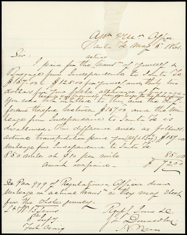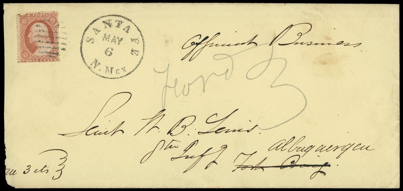 Santa Fe, N. Mex. May 6 (New Mexico Territory), sharp cds with matching grid cancel ties 3¢ dull red (26) , nicked top left, on legal-size amber cover endorsed "Official Business" to Lieut. W.B. Lewis, 8th Infy. Fort Craig N.M., forwarded with pencil " Ford 3 " rating to Albuquerque, original letter datelined "Asst. Qmr. Office, Santa Fe. May 5, 1861" from Capt. J.L. Donald requesting travel reimbursement after mileage disallowed, letter with light stain; cover reduced a bit at left, F.-V.F. territorial use.