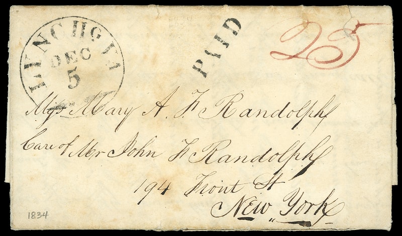 (Slavery) 1834 (Dec. 5) Lynchburg Va. to New York N.Y., well written four-page slavery letter describing someone stopping by their house that had just purchased 12 slaves that they put in the basement, separation of the wife and husbands, etc. poignant window into the period - philosophical commentary, entered mails with "Lynchg. Va. Dec 5" cds with matching "Paid" handstamp and red ms. "25" rating; edge tear and wear, some splitting, F.-V.F., well written view of the period.