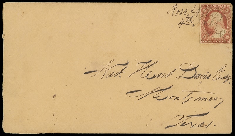"Rose Hill, 4th July 1858", manuscript postmark ties 3¢ dull red (11A) four margins, corner crease, on buff cover to Montgomery, Texas, Very Fine.