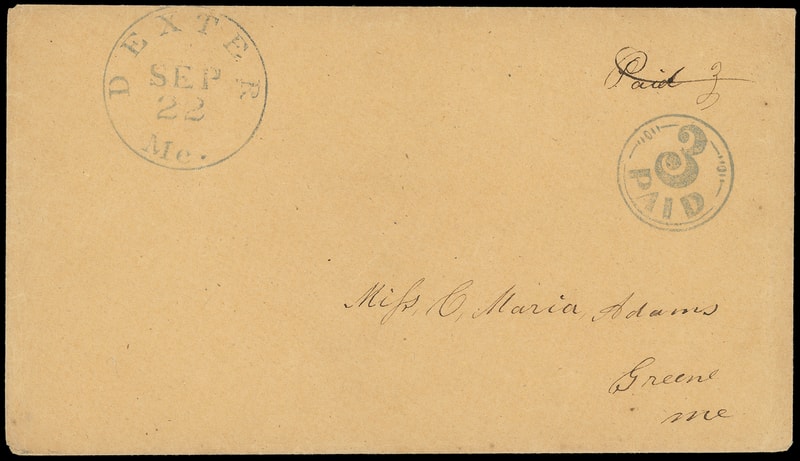 Dexter Me. Sep 22, near blue cds with matching fancy "Paid 3" rating handstamp on buff cover to Greene Me., Very Fine.