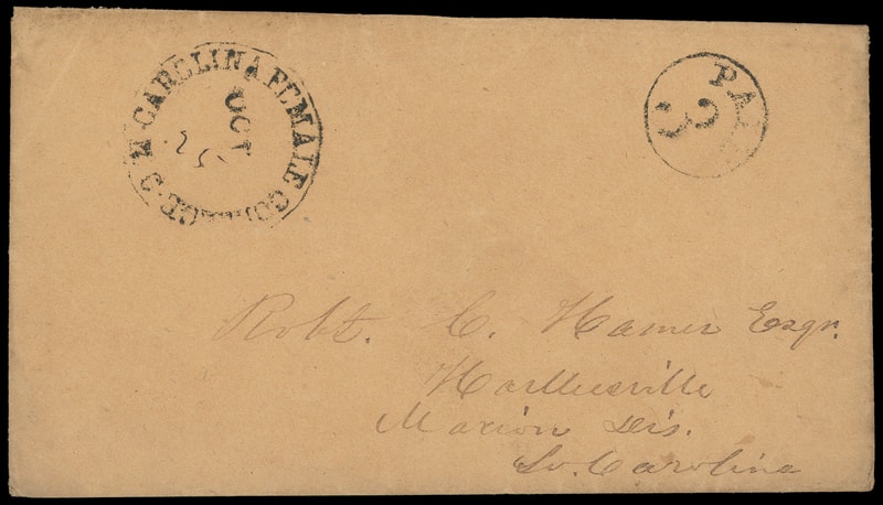 North Carolina Female College, N.C. Oct "25", cds with ms. day with matching "Paid 3" in Circle rating handstamp on buff cover to South Carolina, original 1852 enclosed letter, F.-V.F. and scarce North Carolina college cds.