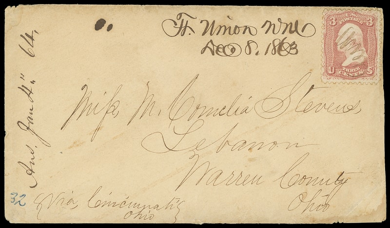 "Ft. Union N.M., Dec 8, 1863", manuscript postmark with matching ms. squiggle cancels 3¢ rose (65) on amber cover to Lebanon, Ohio, endorsed " Via Cincinnati, Ohio " at bottom left; reduced slightly at right, F.-V.F.
