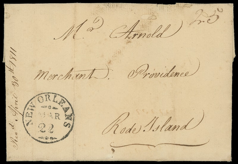 (Orleans Territory) 1811 (Mar. 22) New Orleans La. to Providence R.I., folded cover with "New Orleans, Mar 22" cds and ms. "25" cent rating over 500 miles, docketed received "April 30th 1811" at left; some erosion spots at top, F.-V.F.