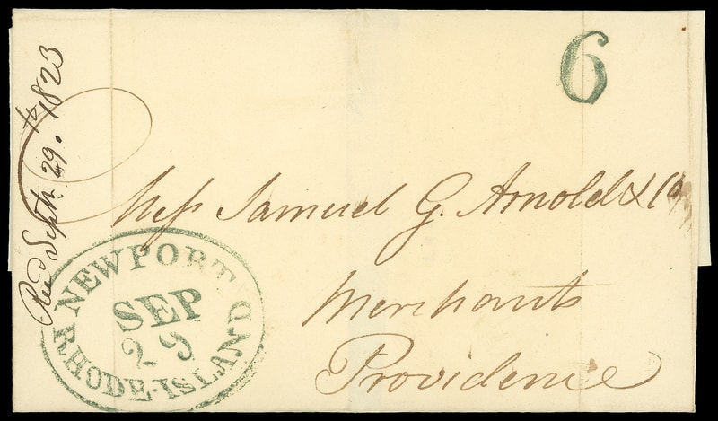 Newport, Rhode-Island, Sep 29, green oval postmark with matching "6" rating handstamp on 1823 folded cover to Providence R.I.; file folds, Very Fine and attactive.