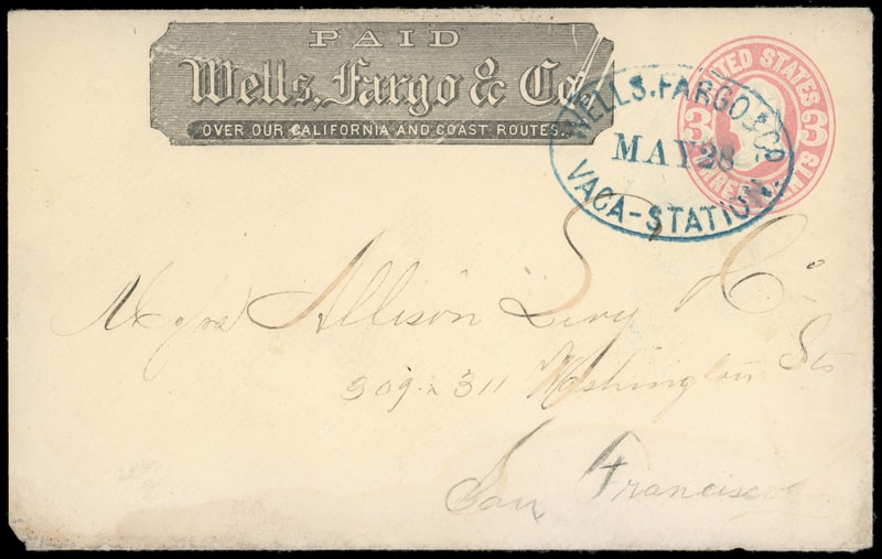 Wells Fargo & Co., Vaca-Station, May 28, blue oval datestamp (Leutzinger type 11-9) on 3¢ pink (U59) entire to San Francisco Cal., black Haller type E printed frank; reduced slightly at right, otherwise Very Fine.