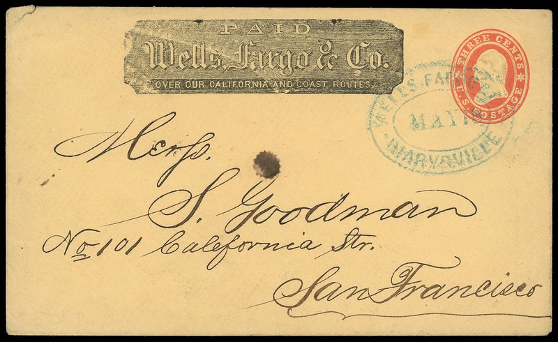 Wells, Fargo & Co., Marysville, May 18, blue double-oval datestamp cancels 3¢ red (U27) buff Star die entire with printed "Wells, Fargo & Co." frank to San Francisco Cal.; some edge wear, ink spot, Very Fine.