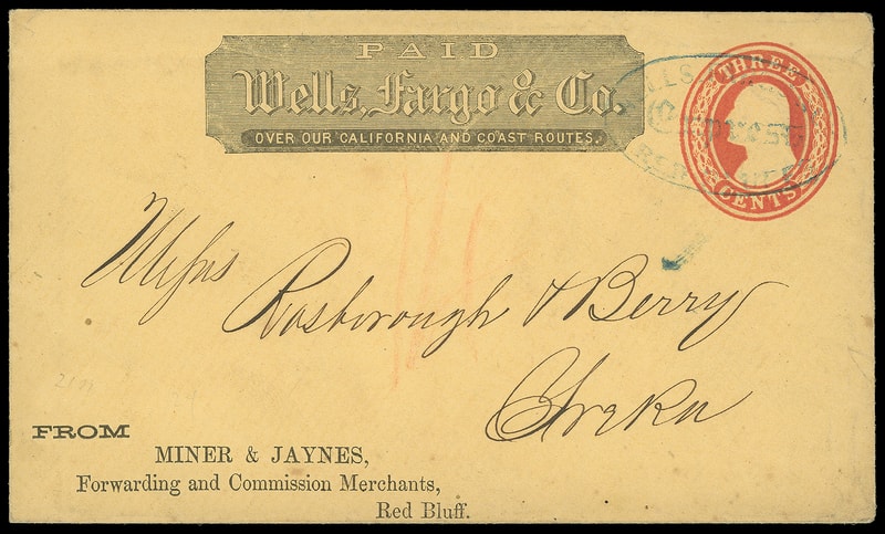 Wells, Fargo & Co. Express, Red Bluffs, blue oval cancels 3¢ red (U10) buff Nesbitt entire with printed "Wells, Fargo & Co." frank and "Miner & Jaynes, Forwarding and Commission Merchants, Red Bluff" corner card to Yreka, Cal., Very Fine.