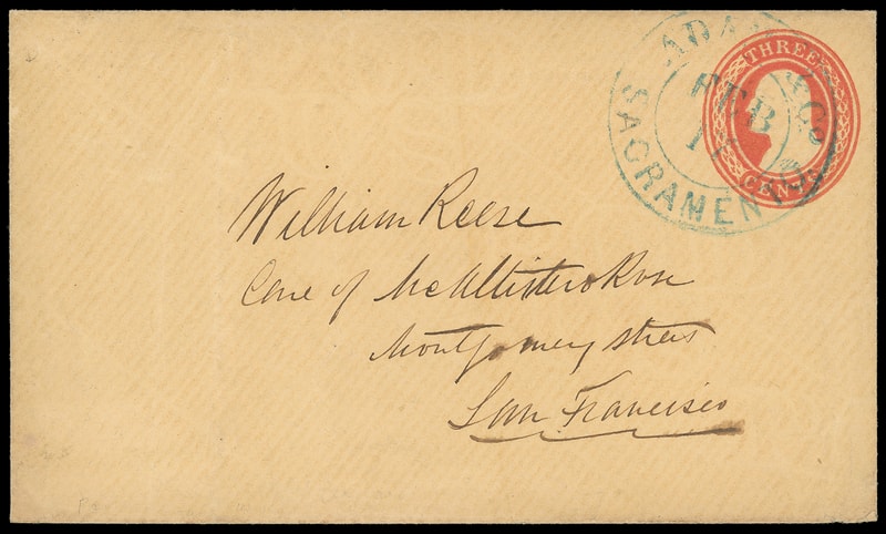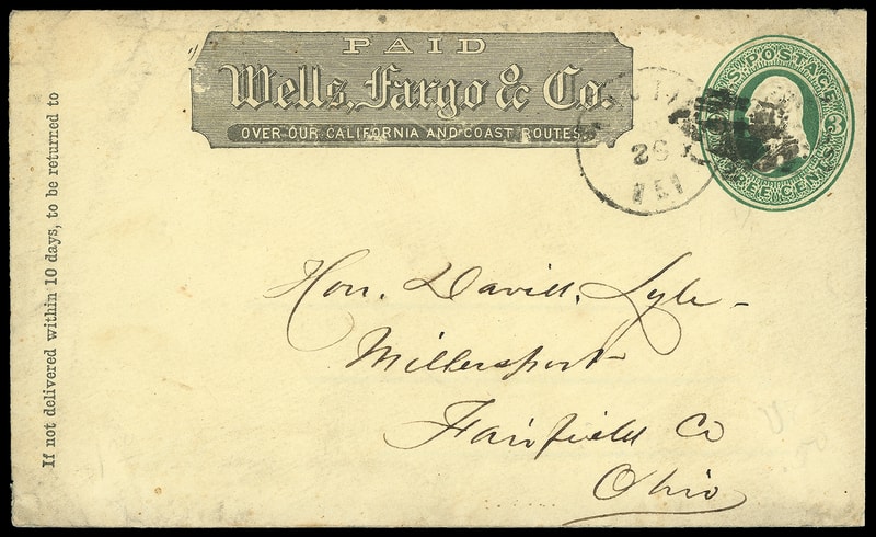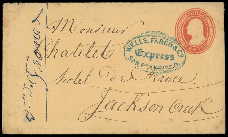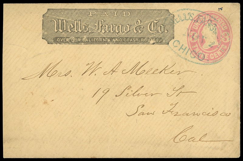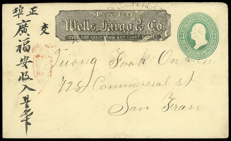 Wells, Fargo & Co., Placerville, May 8, black company oval on 3¢ green entire to San Francisco Cal., Chinese directional endorsement and handstamp at left and reverse, F.-V.F.