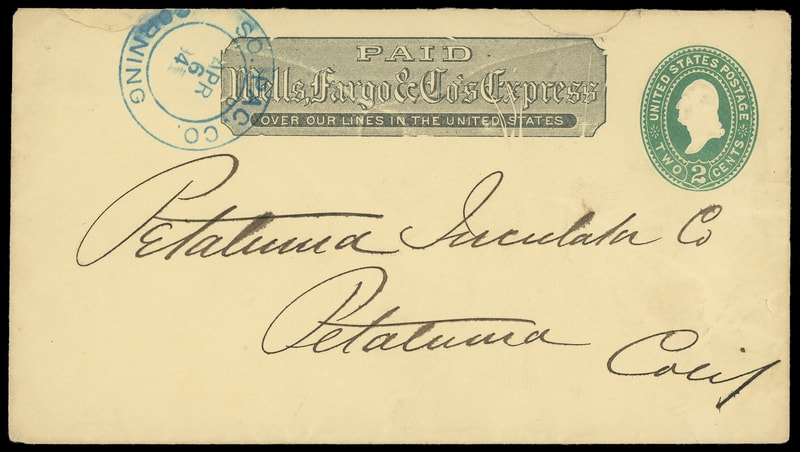 Wells Fargo & Co., Tomales, Mar 31, black oval cancels 3¢ green entire with black printed Wells Fargo frank to New York City, entered mails with " Cent. Pacific R.R. " cds at the railhead, Very Fine and scarce use from Tomales via the Central Pacific.