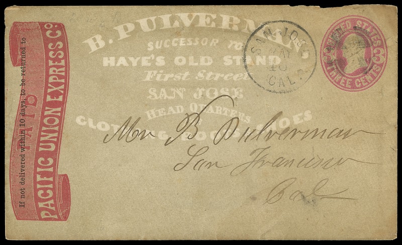 Pacific Union Express Co., red Paid ribbon frank at left on 3¢ pink (U58) entire with gray B. Pulverman Clothing, Botts & Shoes overall shaded ad cover canceled by "San Jose, Cal. May 16" duplex to San Francisco Cal.; small edge tear, flap missing, F.-V.F.