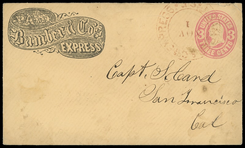 Bamber & Co's Express, printed ribbon frank on 3¢ pink (U58) mint entire, F.-V.F.