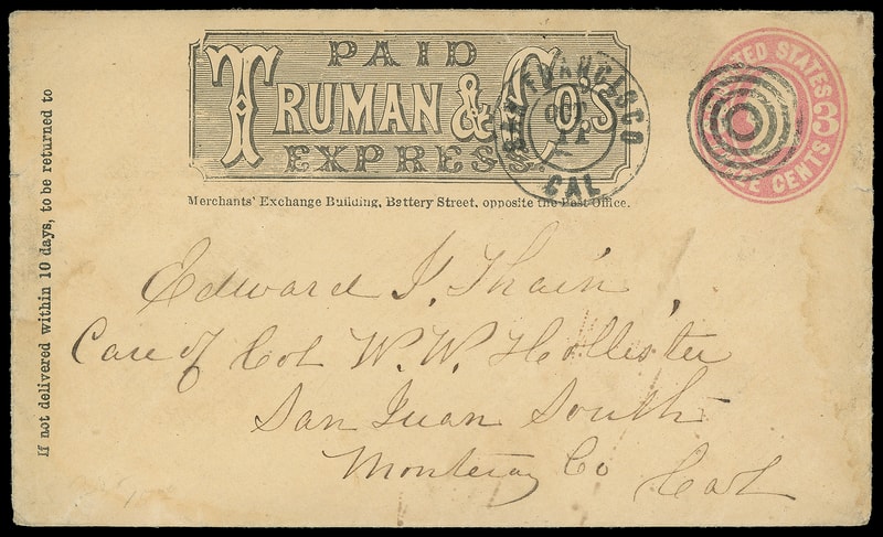 Truman & Co's Express, paid frank on 3¢ pink (U59) buff entire canceled by four-ring target duplexed with "San Francisco Cal. Oct 11" cds San Juan South, Cal.; some wear, F.-V.F.